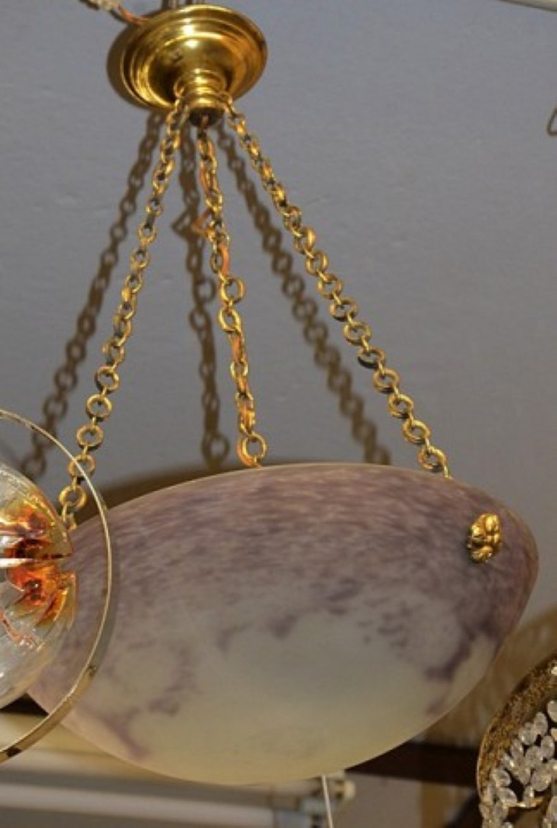 Jugendstil Deckenlampe mit Messingmontur und lilafarbenem Pat de verre - Glas, unleserliche Ätzsignatur, Durchmesser 36cm, um 1900/20