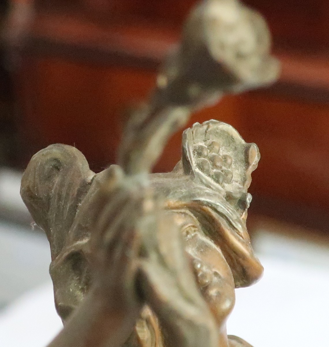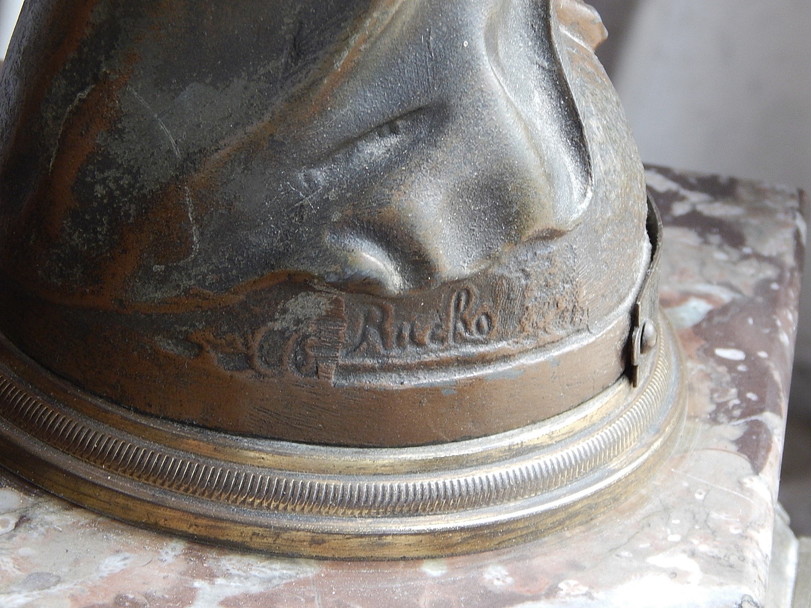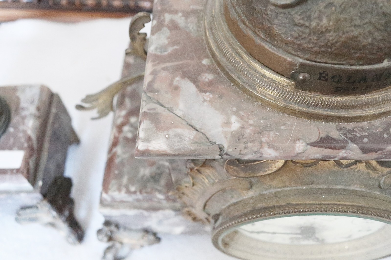 Kaminuhr mit figürlichem Aufsatz, Regule bronziert, signiert Rucho sowie mit einem Paar passenden Kerzenleuchter, Marmor, restauriert, maximale Höhe ca. 58 cm, Frankreich um 1900