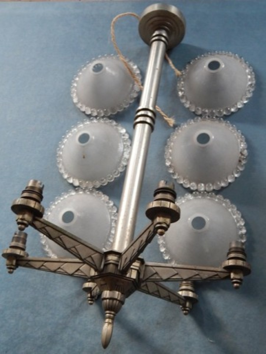 6-armiger ArtDeco Deckenlüster mit Messing vernickelter Montur, Charles Ranc zugeordnet, mit 6 satinierten Glasschalen, Ezan zugeordnet, unrestauriert, um 1920/30, Höhe ca.79cm, Durchmesser ca.58cm