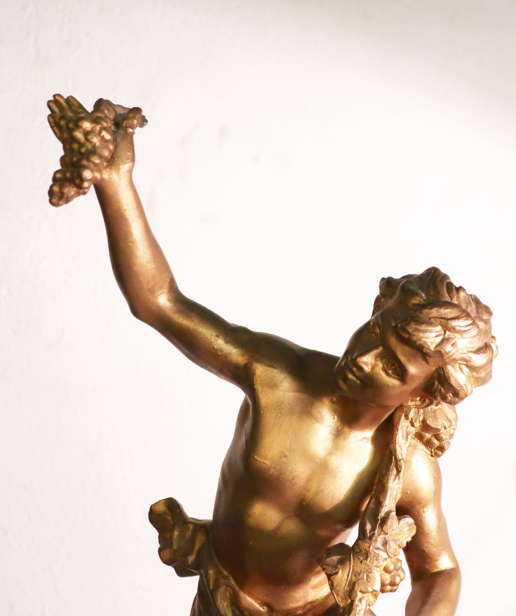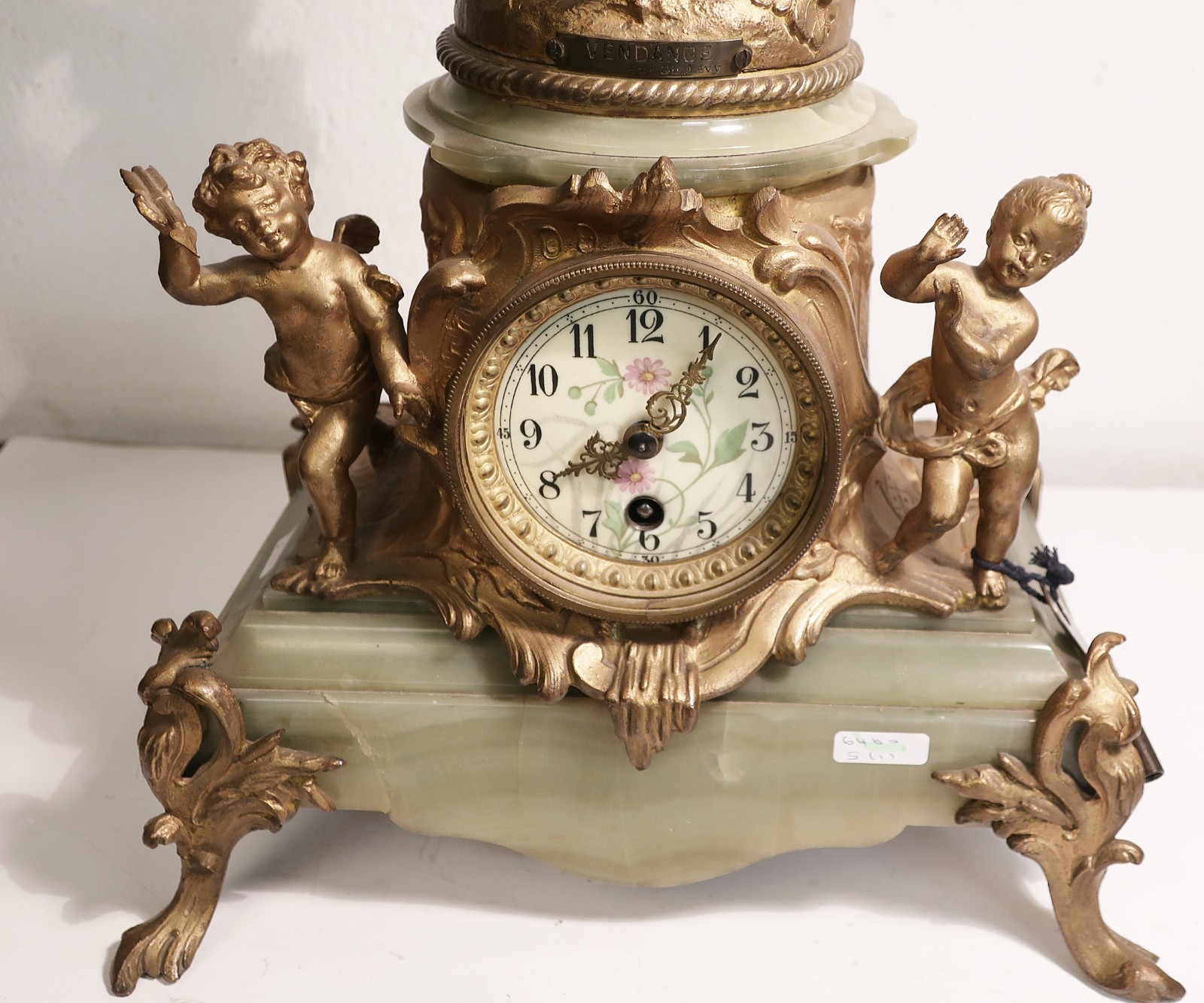 Magnificent mantel clock with sculpture "Boy with grapes and side putti", regule mounted on green onix base, bronzed, clockwork without chime with arabic numerals, unrestored, around 1900, height ca. 64cm