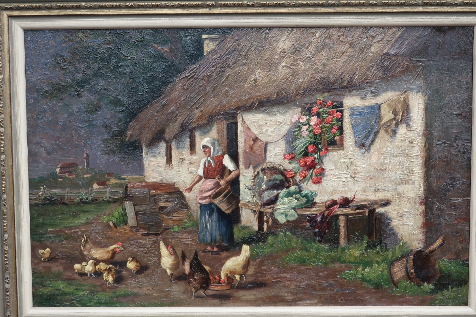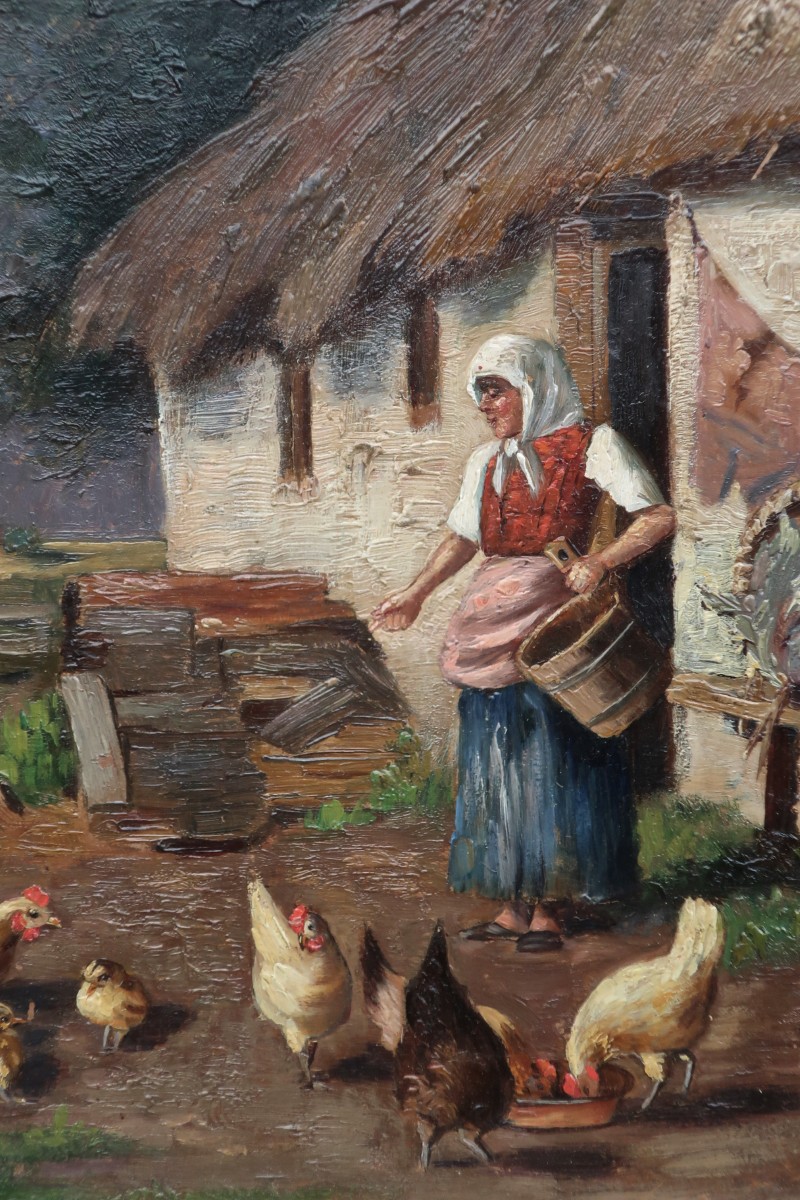 "Bäuerin füttert die Hühner", Öl auf Malkarton, wohl unsigniert, ca.26x40cm
