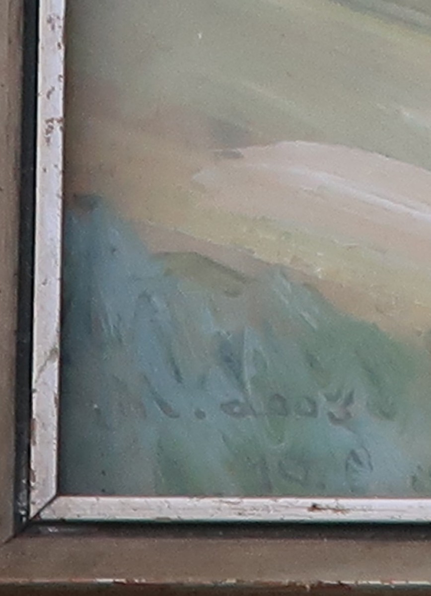 "Mittelgebirgslandschaft", wohl Öl auf Papier, unten links unleserlich signiert, hinter Glas gerahmt, Rahmenmaß ca. 33x43, 5cm
