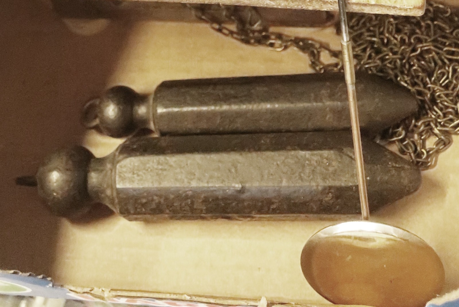 Lackschilderuhr mit Messingpendel und gußeisernen Gewichten, 2.Hälfte 19.Jahrhundert