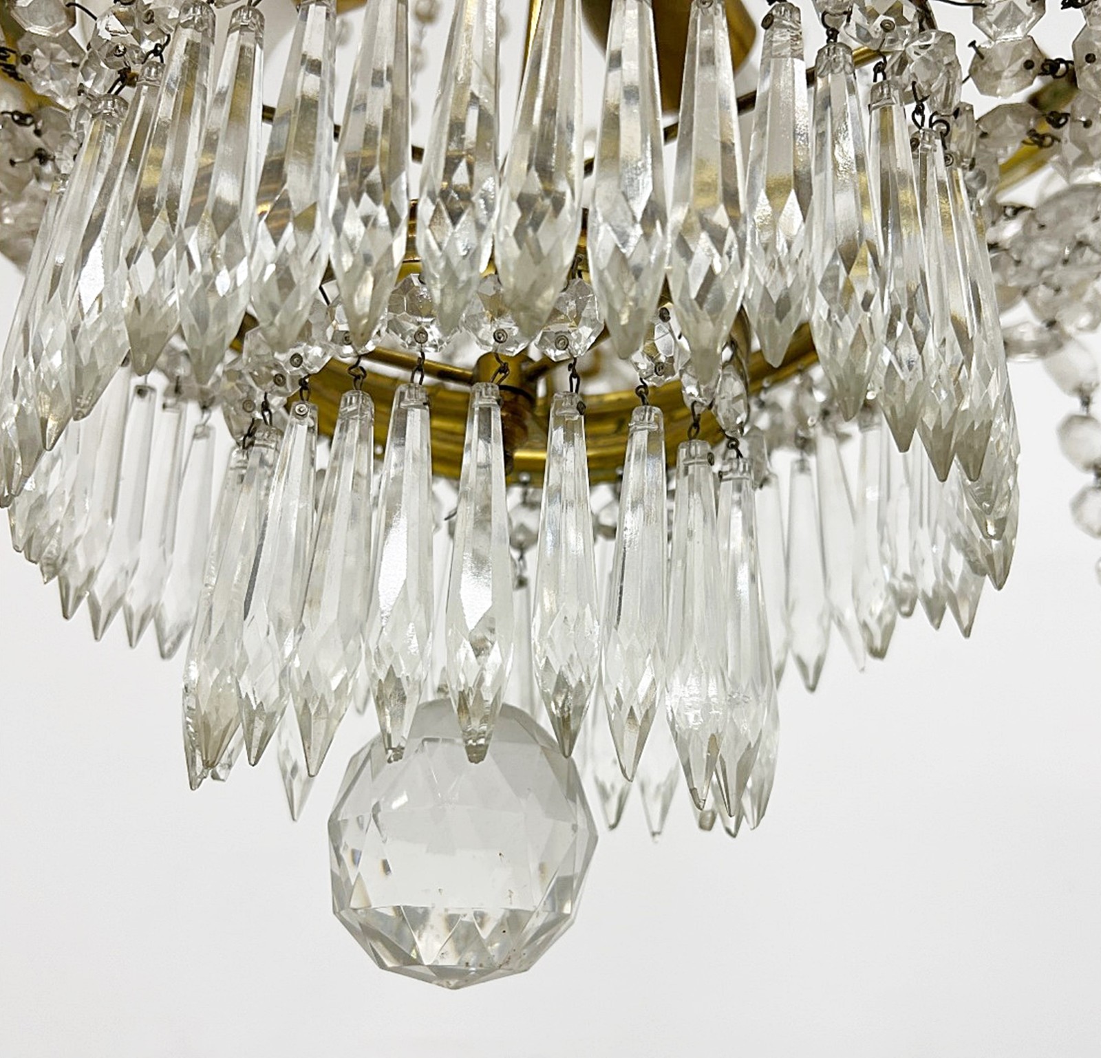 6-armiger Lüster mit Glasprismen und Messingmontur, Höhe ca. 100cm, Durchmesser ca. 70cm