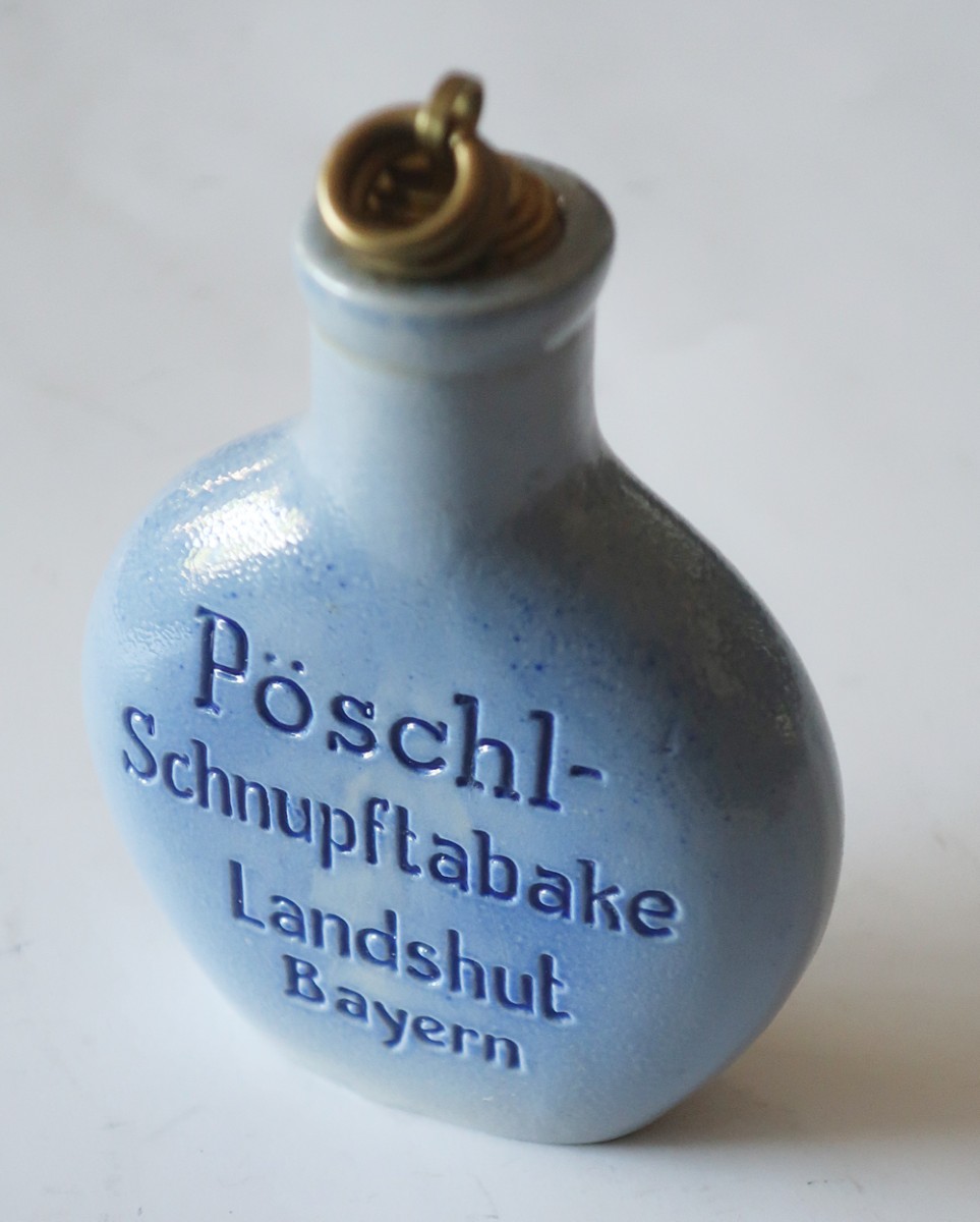 Schnupftabaksflasche "Pöschl-Schmalzler - Pöschl Schnupftabake, Landshut i.B.", westerwälder Keramik, salzlasiert, Höhe ca. 8, 5cm, 20.Jahrhundert