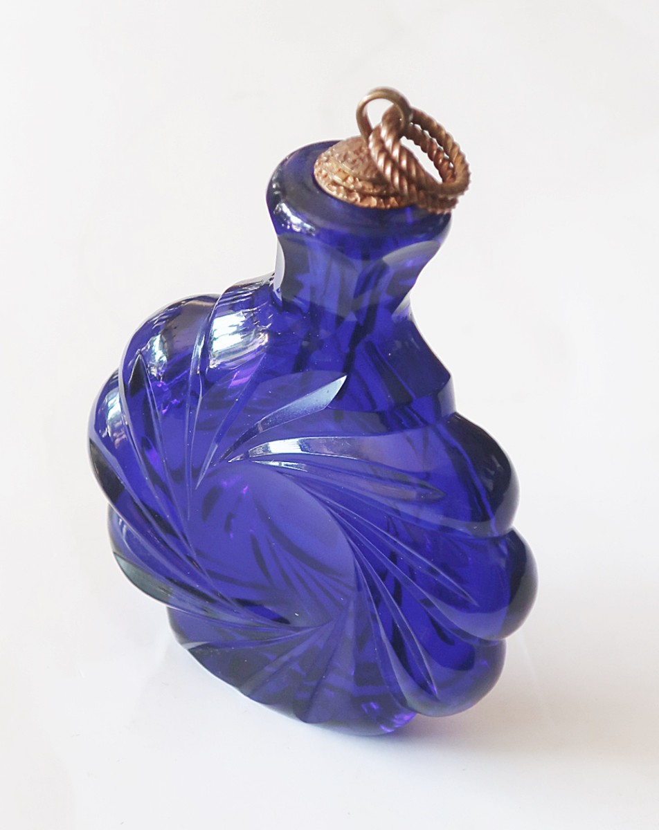 Flache Schnupftabakflasche mit blauem Überfang, signiert Siskamit Kupferverschluss, Durchmesser ca. 7 cm, Höhe ca. 10 cm