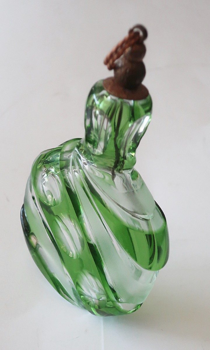 Flache Schnupftabakflasche mit grünem Überfang und satiniertem Glas, mit Kupferverschluss, Durchmesser ca. 6, 7 cm, Höhe ca. 11 cm