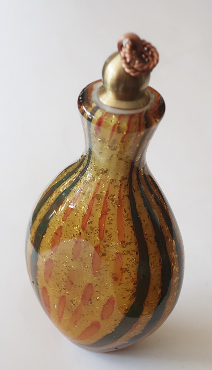 Bauchige, flache, goldfarbene Schnupftabakflasche mit Kupfer-u. Messingverschluss, Durchmesser ca. 6 cm, Höhe ca. 12, 5 cm