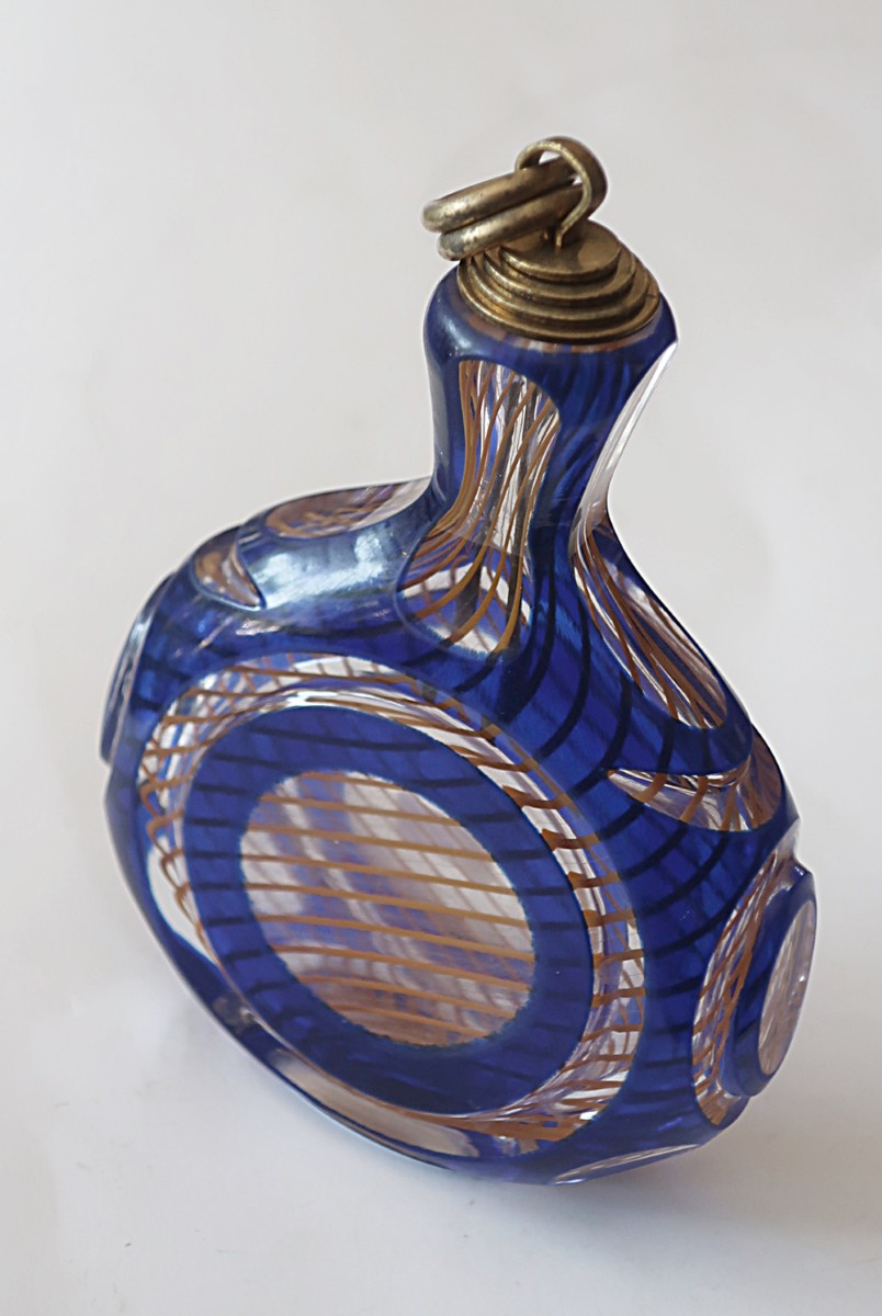Flache Schnupftabakflasche mit blauem Überfang und in feiner Fadentechnik mit gelborangefarbenen Fäden gearbeitet, mit Messingverschluss, Durchmesser ca. 7 cm, Höhe ca. 10, 5 cm