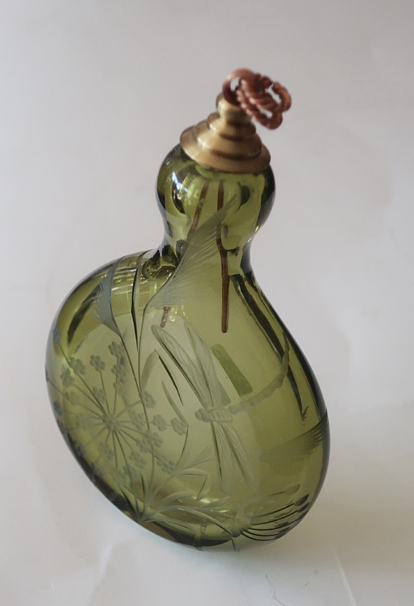 Große, flache Schnupftabakflasche mit moosgrünem Überfang, figural graviert mit Libelle sowie floralem Dekor, mit Kupfer-/ Messingverschluss, Durchmesser ca. 7, 3 cm, Höhe ca. 11, 5 cm