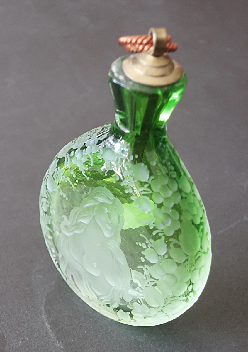 Flache Schnupftabakflasche, grüner Überfang, mit erotischer Darstellung und floralem Dekor graviert, mit Kupfer-/ Messingverschluss, Durchmesser ca. 6, 8 cm, Höhe ca. 10, 5 cm