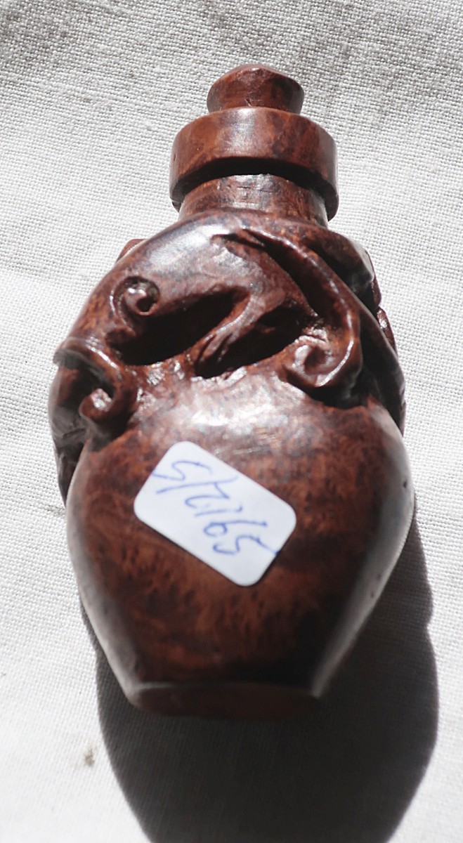 Kleine Schnupftabakflasche, Wurzelholz, figural beschnitzt, Durchmesser ca. 3, 5 cm, Höhe ca. 7 cm