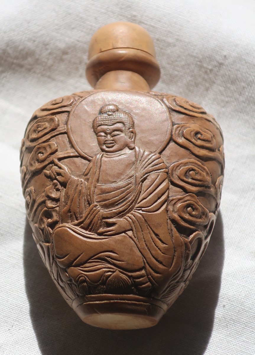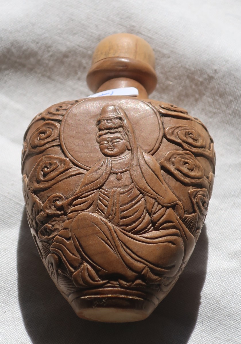 Schnupftabakflasche, mit figürlichen Halbreliefs eines Herrscherpaares verziert, Durchmesser ca. 5 cm, Höhe ca. 8 cm