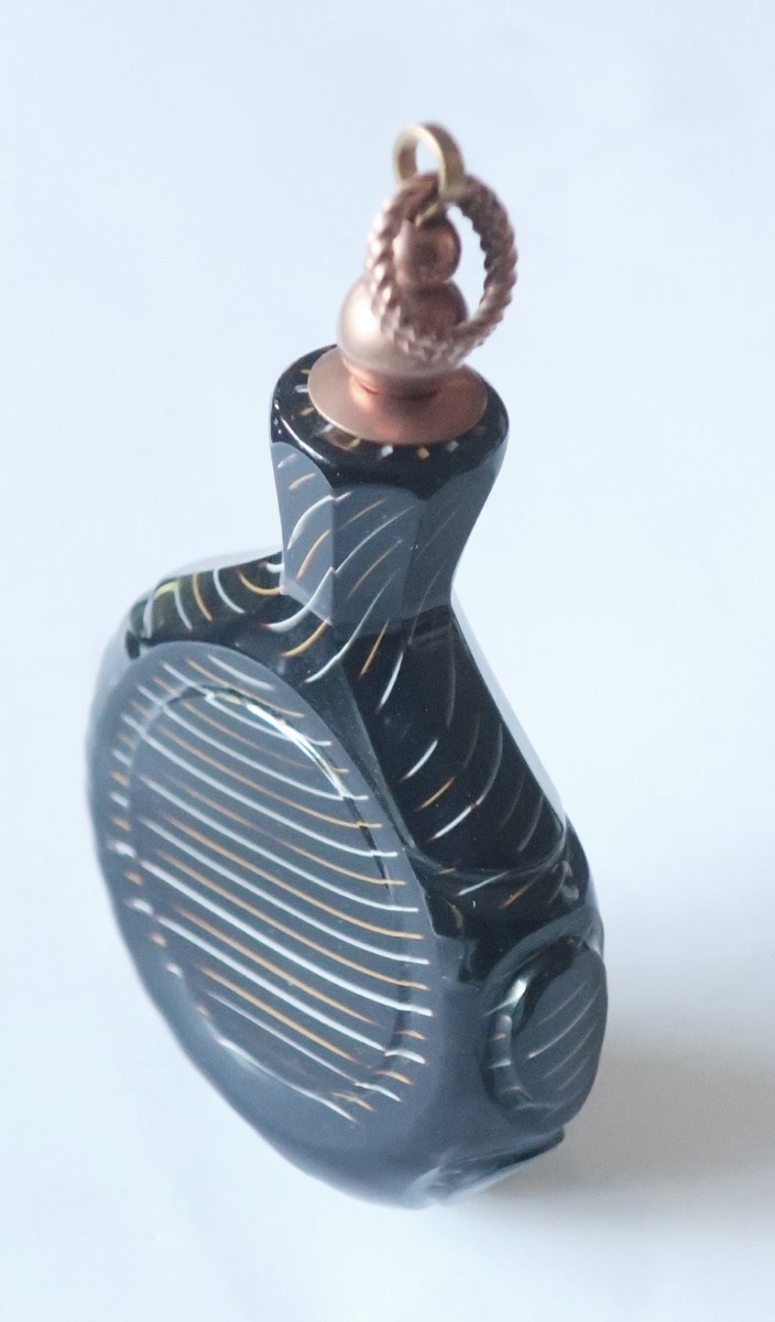 Flache Schnupftabakflasche mit schwarzem Überfang, mit filigranem Fadendekor in weißen und gelben Farbtönen gearbeitet, mit Kupferverschluss Durchmesser ca. 6, 3 cm, Höhe ca. 10, 5 cm