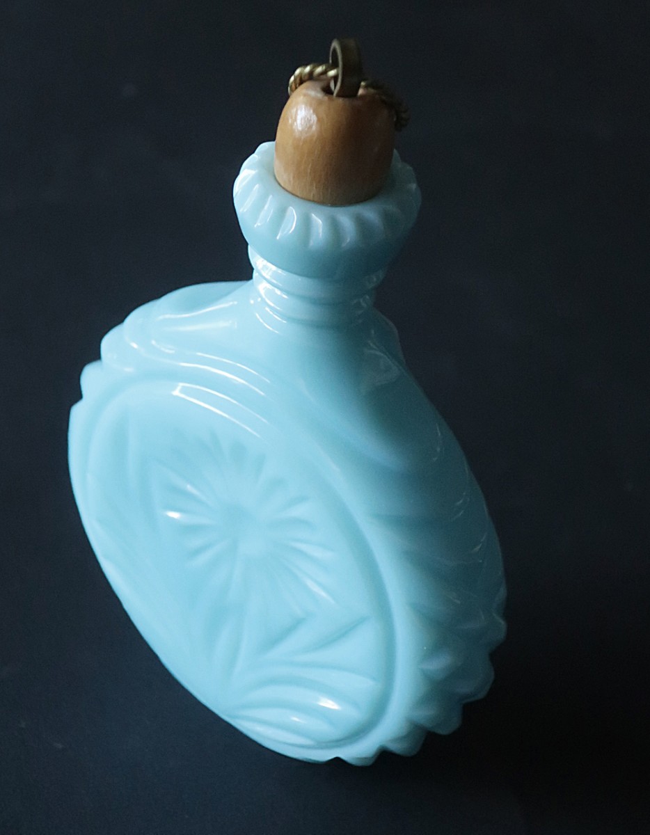 Flache Schnupftabakflasche mit hellblauem, opaken Glas und mit Holzverschluss, Durchmesser ca. 7, 8 cm, Höhe ca. 11, 5 cm