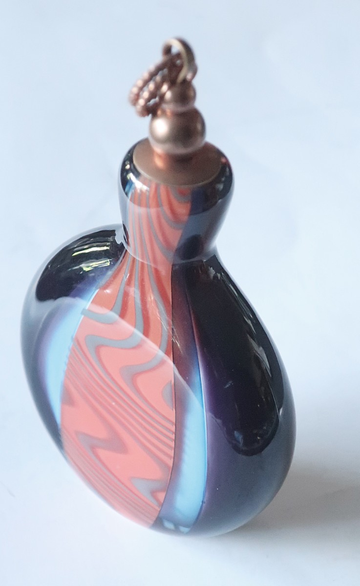 Flache Schnupftabakflasche in lila-, blauen-, rotbraunen Farbtönen, unleserlich signiert und datiert 2011, mit Kupferverschluss, Durchmesser ca. 7, 5 cm, Höhe ca. 12 cm