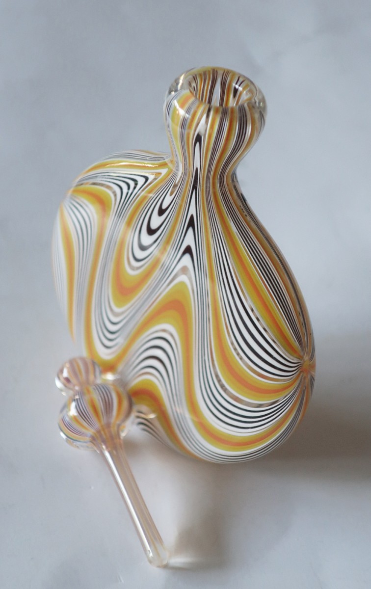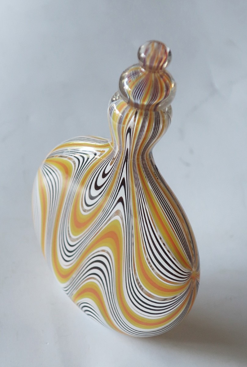Flache Schnupftabakflasche mit filigranem Fadendekor in weißen, gelben und orangenen Farbtönen, mit Glasstöpsel, Durchmesser ca. 7, 5 cm, Höhe ca. 11, 5 cm