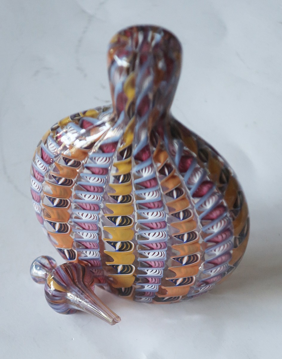Flache Schnupftabakflasche mit filigranem, bunten Fadendekor, s.g. Mascherl, mit Glasstöpsel, Durchmesser ca. 7 cm, Höhe ca. 11 cm