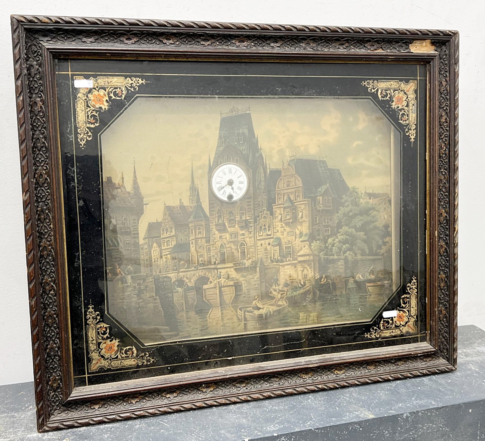 Bilderuhr, Chromolitho, hinter Glas gerahmt, Uhrwerk wohl defekt, Rahmenmaß ca.58, 5x70, 5cm