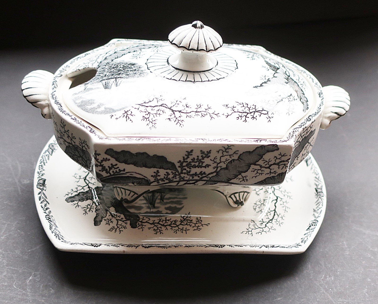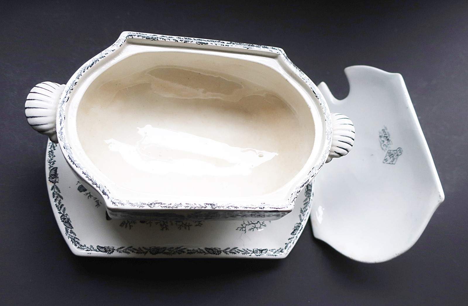 Kleine Terrine auf einem Tablett, Fayence mit Diamant Register Marke, 1882, September 29th, ca. 22 x 15 x 13cm (B x T x H)